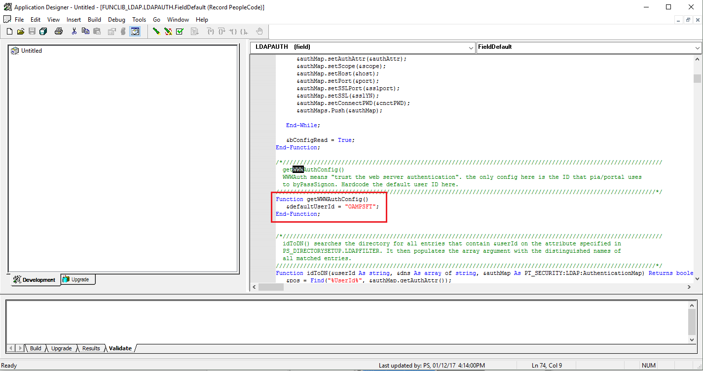 - Right click on 'LDAPAUTH' and View Peoplecode. Search for function 'getWWWAuthConfig()' and provide 'OAMPSFT' as userid.